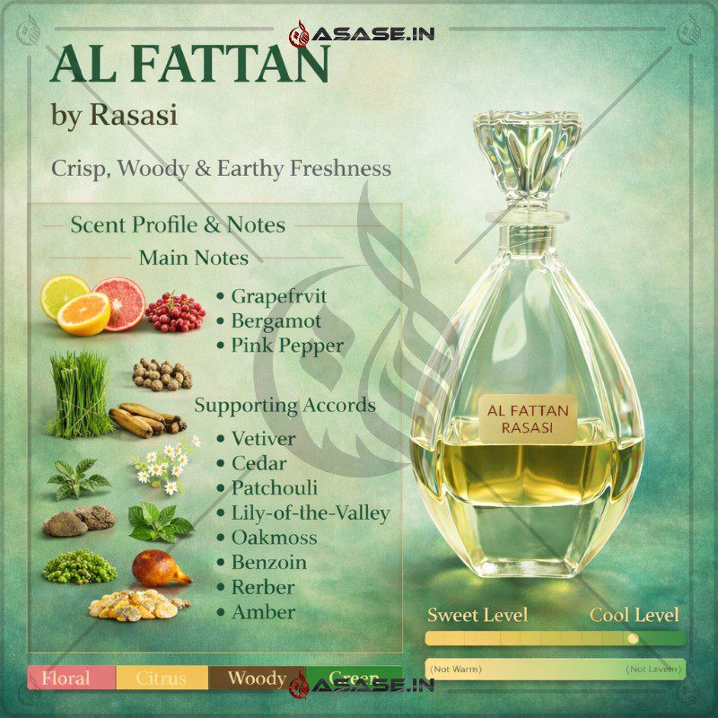 Al Fattan by Rasasi is a refined and refreshing woody fragrance designed for men who appreciate clean, modern and nature-inspired scents. It opens with a vibrant burst of grapefruit and bergamot, enhanced by the subtle spiciness of pink pepper, creating a crisp and energizing first impression.