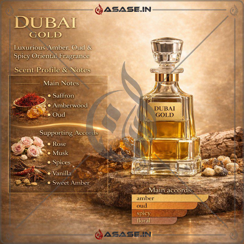 Dubai Gold Attar is a luxurious oriental fragrance inspired by the richness of oud and amber. The scent opens with saffron and amberwood, followed by soft floral rose and warm spices, while the base of musk and vanilla creates a smooth and long lasting aroma. Discover the elegance of Dubai Gold Attar available at Asase Store.