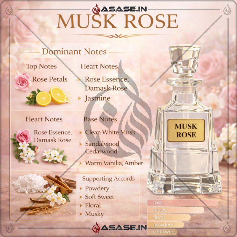 The base of Musk Rose Attar is where its true elegance shines. Clean white musk forms the foundation, providing softness, warmth, and excellent longevity. This is complemented by sandalwood, cedarwood, warm vanilla, and amber, which add a creamy and gently woody finish. The result is a fragrance that stays close to the skin and leaves behind a soft, powdery trail.