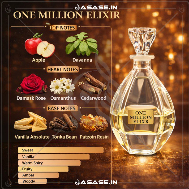 One Million Elixir is a rich and seductive fragrance blending sweet apple, warm vanilla, and spicy woody notes. A bold, long-lasting perfume crafted for confident personalities who love luxury scents.