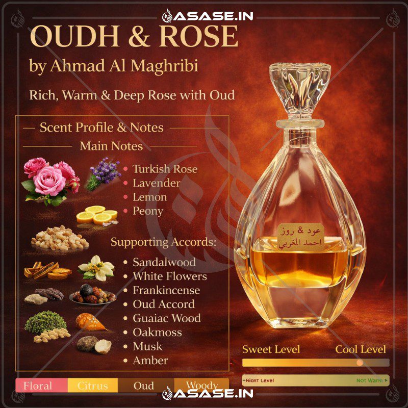 Oudh & Rose by Ahmad Al Maghribi is an opulent and sophisticated fragrance that beautifully combines the elegance of rose with the depth of oud. The scent opens with a refined floral and citrus introduction, where Turkish rose and peony are uplifted by fresh lemon and calming lavender, creating a smooth yet vibrant opening.